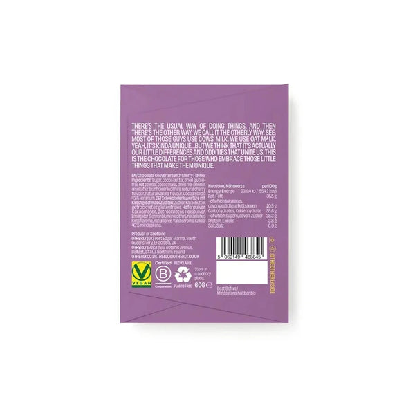 Ingredients: Sugar (31%), cocoa butter (22%), dried gluten-free oat powder (22%), cocoa mass (21%), dried rice powder (3%), emulsifier (sunflower lecithin) (<1%), natural cherry flavour (<0.5%), natural vanilla flavour (<0.5%). Cocoa Solids: 43% Minimum.