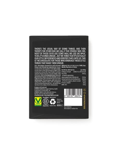 Ingredients: Sugar, cocoa butter, dried gluten-free oat powder, cocoa mass, dried rice powder, ginger (<2%), cinnamon, emulsifier (sunflower lecithin), natural vanilla flavour. Cocoa Solids: 43% Minimum.
